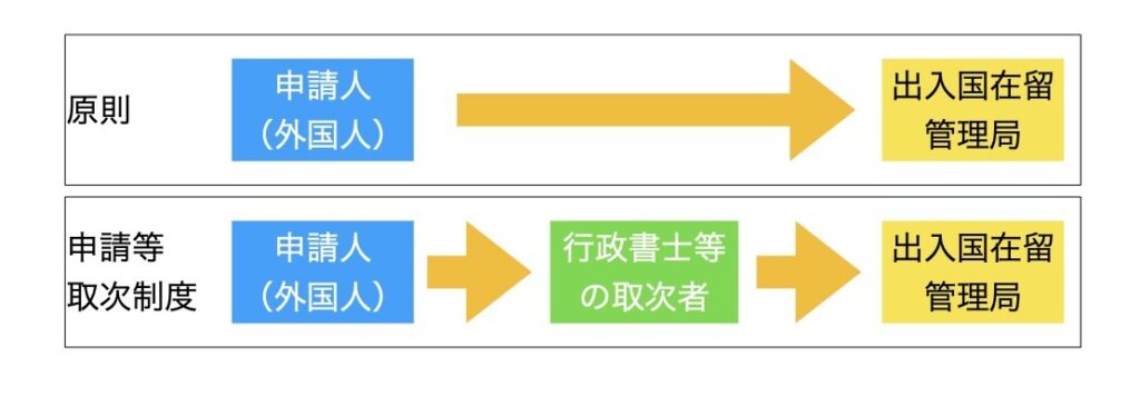 ただし、法定代理人などの代理人が申請を行う場合、申請・届出案件の増加による窓口の混雑緩和や申請人・届出人の負担軽減等を目的として、外国人本人の申請等を取次できる者を定め、その取次できる者が申請等を行う制度があります。