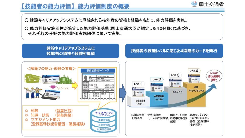 建設技能者の能力評価とは、建設キャリアアップシステム(CCUS)に登録・蓄積された情報(就業履歴、保有資格など)を活用し、個々の技能者の技能・経験を客観的にレベル分け(レベル1~4)する仕組みです。他の職域と違い、建設業オリジナルの制度です。