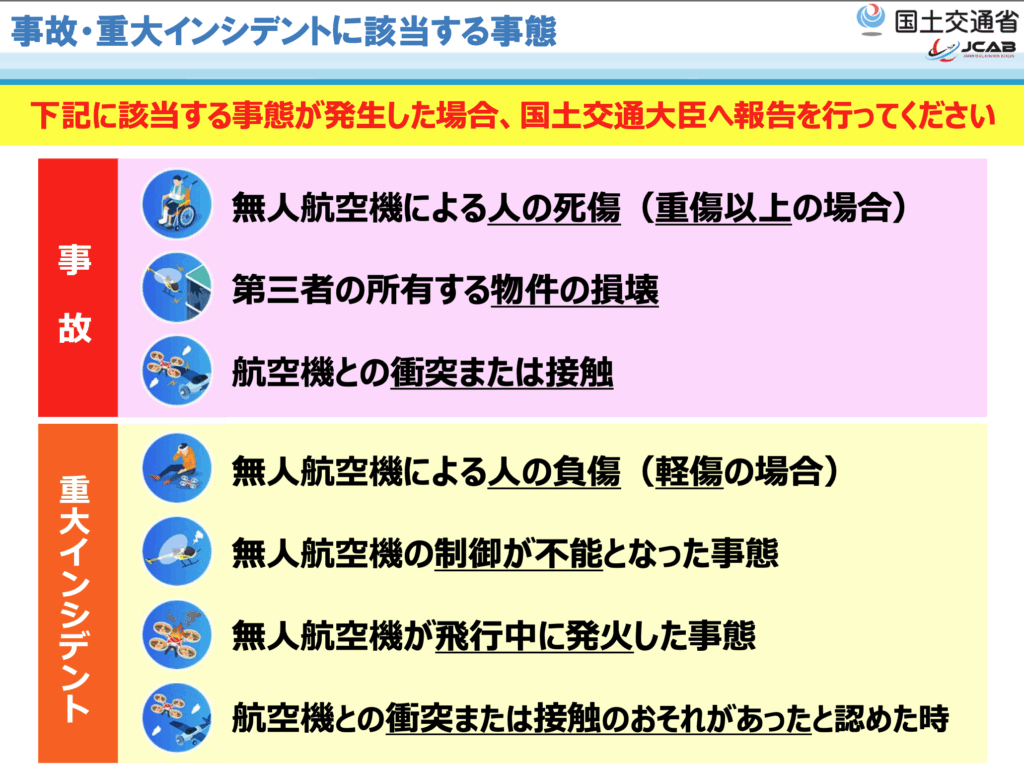 航空法では、ドローンの事故や特定のトラブル(重大インシデント)が発生した場合、操縦者や所有者に国土交通大臣への報告義務が課されています。