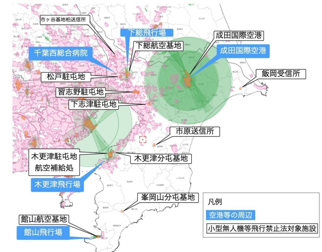 航空法と小型無人機等飛行禁止法に基づく千葉県のエリアを表記します。