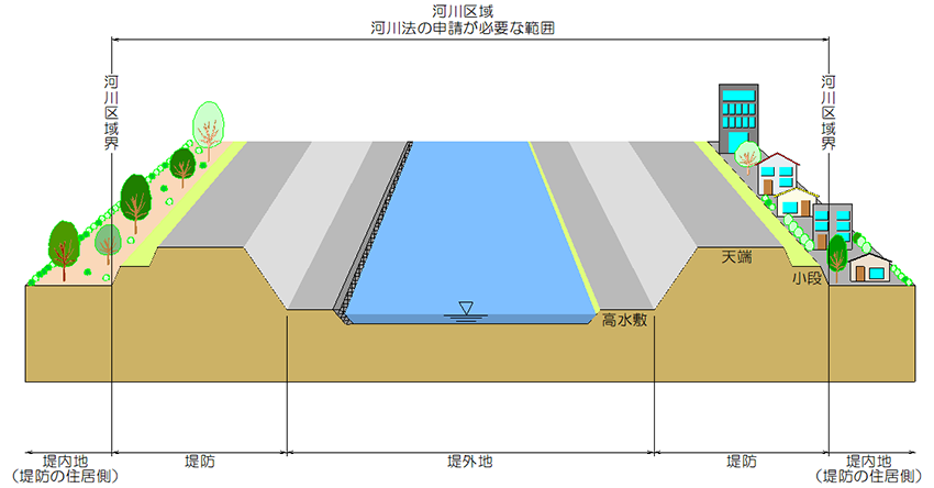 すべての河川に適用されるわけではありませんが、河川区域のイメージは上の図のとおりです。