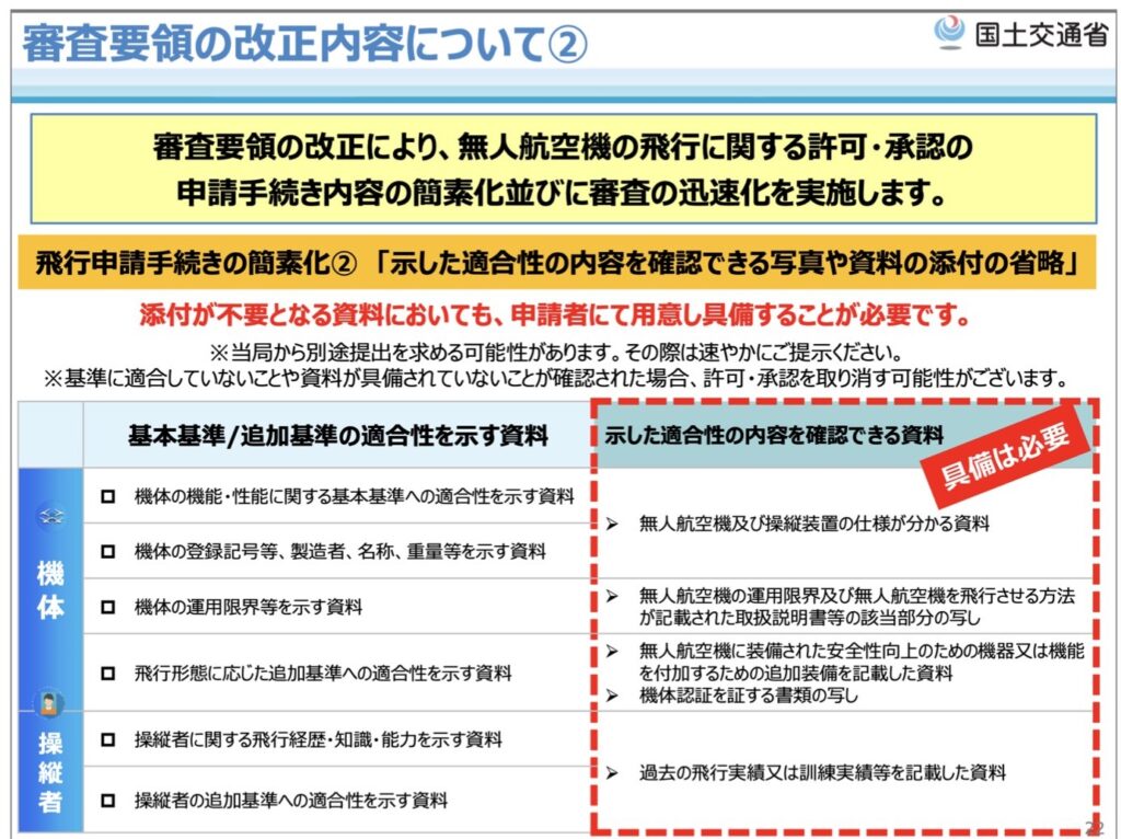 これらは無人航空機の飛行に関する許可・承認の申請手続き内容の簡素化並びに審査の迅速化のために実施されました。一方で、申請者側には自己責任で資料を管理することが強く求められています。