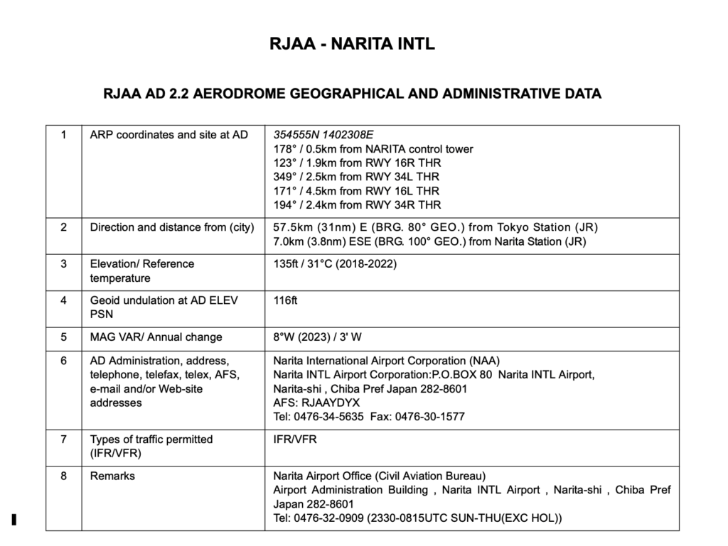 国交省ホームページから引用(ログイン後、AIPのPart3で空港等のデータが参照できます。)