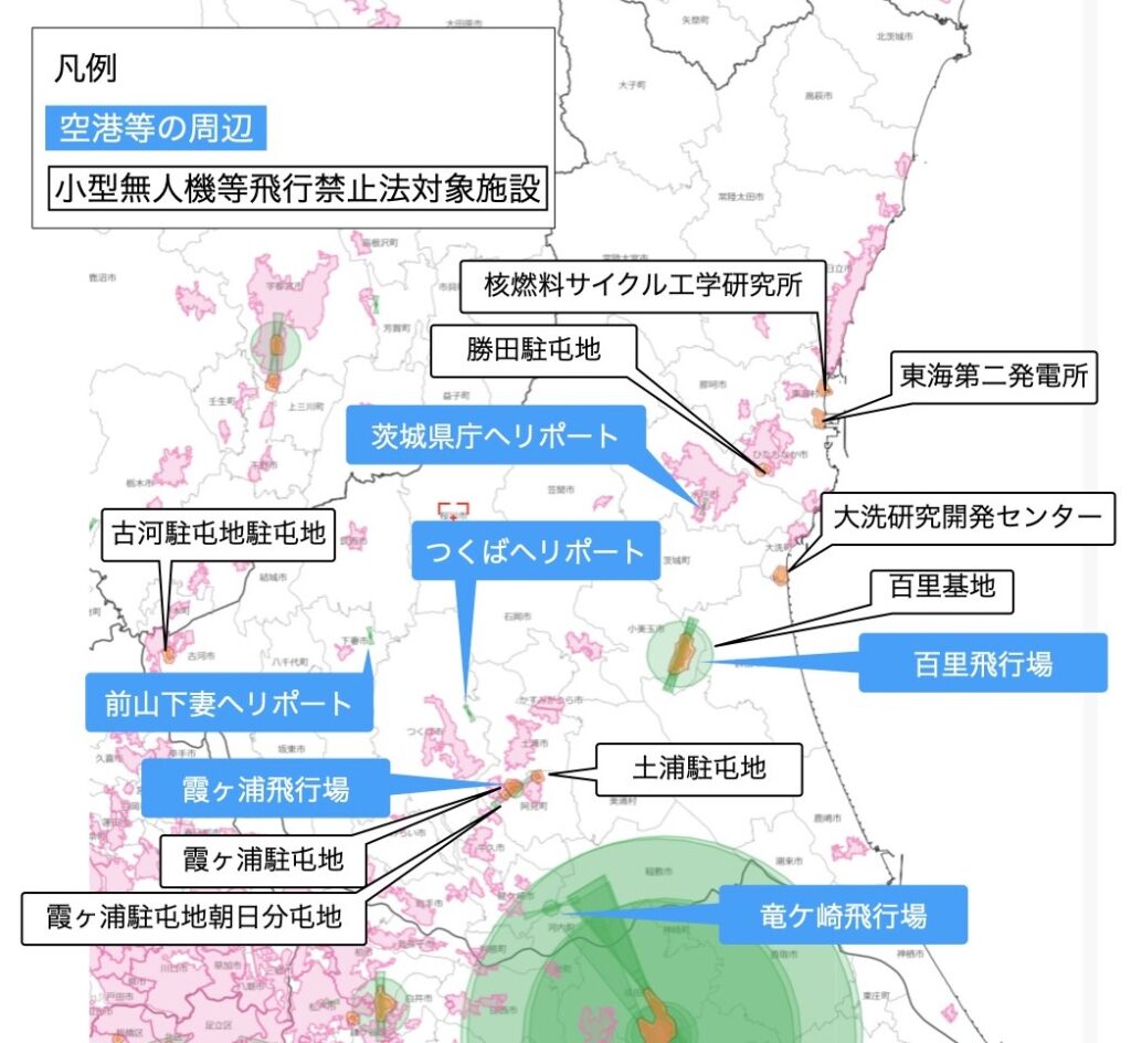 航空法と小型無人機等飛行禁止法に基づく茨城県の飛行禁止エリアを表記します。