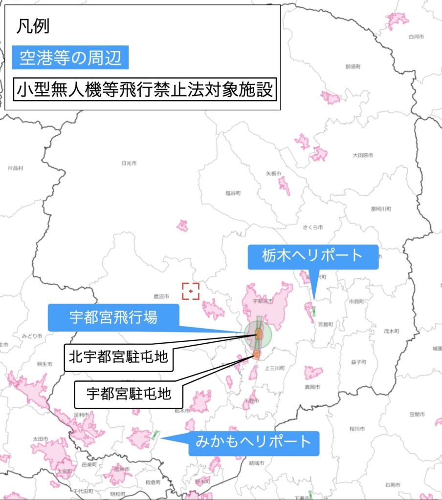航空法と小型無人機等飛行禁止法に基づく栃木県の飛行禁止エリアを表記します。