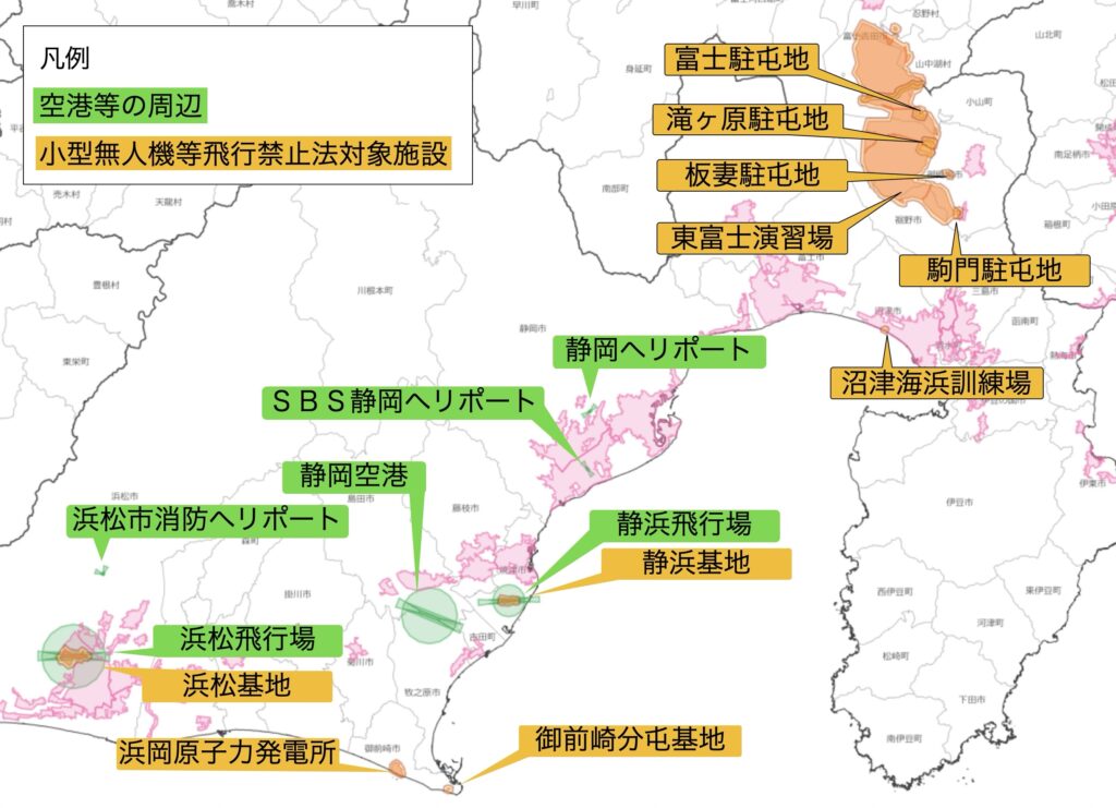 航空法と小型無人機等飛行禁止法に基づく静岡県の飛行禁止エリアを表記します。