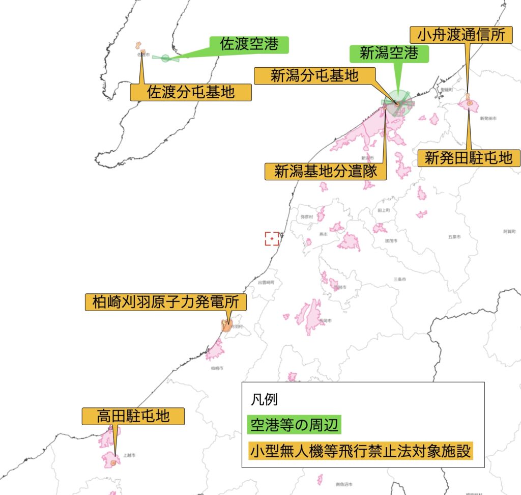新潟県には、ドローンの飛行に注意を要する飛行場2箇所、防衛関連施設6箇所及び原子力発電所が1箇所あります。