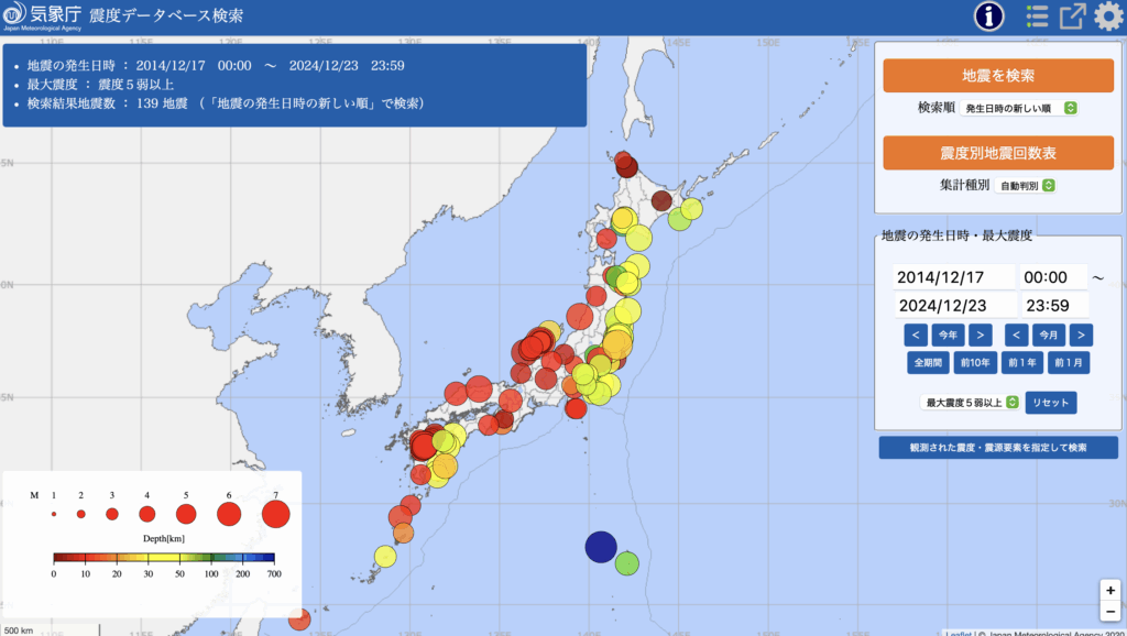 出典:気象庁震度データベース検索 https://www.data.jma.go.jp/svd/eqdb/data/shindo/index.html(過去10年震度5弱以上は139回)