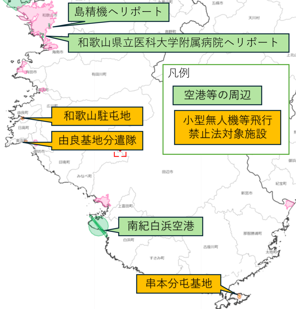 航空法と小型無人機等飛行禁止法に基づく和歌山県の飛行禁止エリアを表記します。