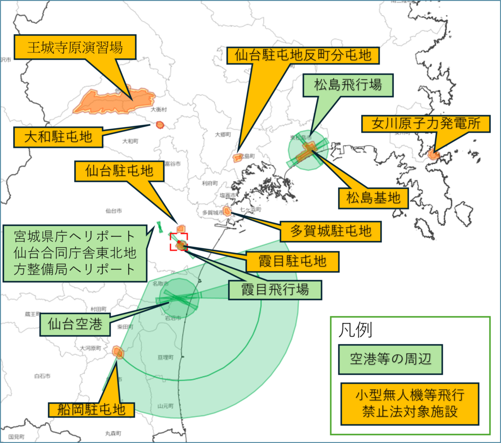 宮城県には、ドローンの飛行に注意を要する飛行場等5箇所、防衛関連施設8箇所、原子力発電所1個所があります。