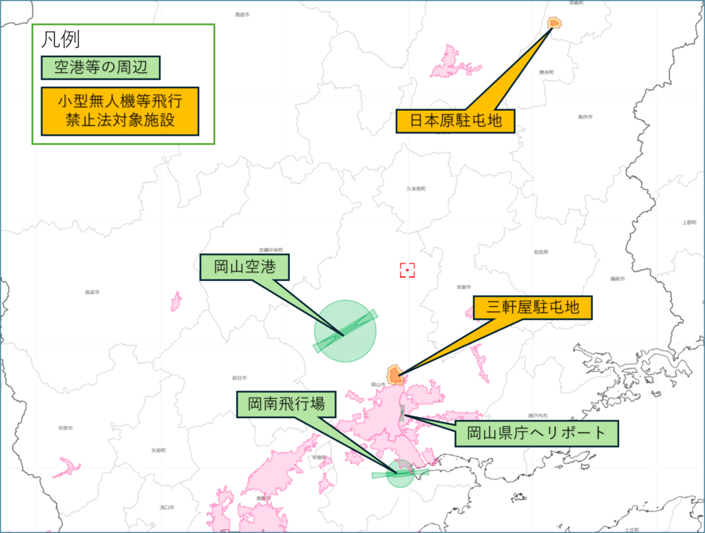 航空法と小型無人機等飛行禁止法に基づく岡山県の飛行禁止エリアを表記します。